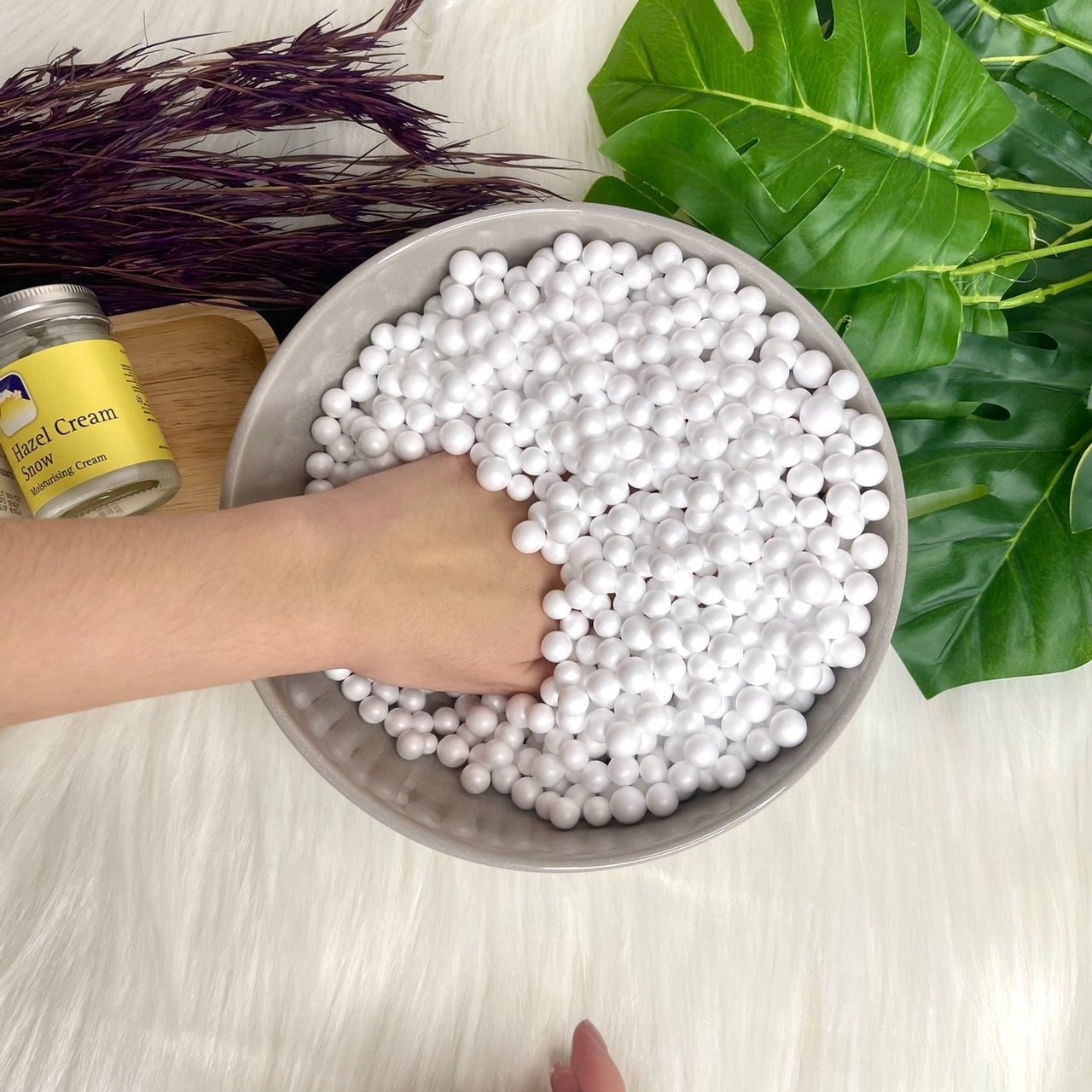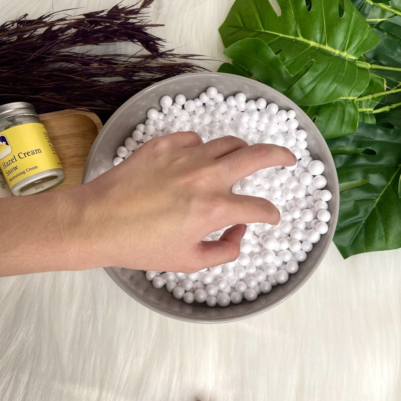 ทดสอบความเหนียวเหนอะหนะของครีมภูเขาด้วยการทาครีมครีมภูเขาที่มือและจุ่มลงไปในเม็ดโฟม ซึ่งโฟมมีลักษณะบางเบาและติดผิว ยิ่งผิวแห้งๆเนี่ยยย จะมีไฟฟ้าสถิตติดง่าย