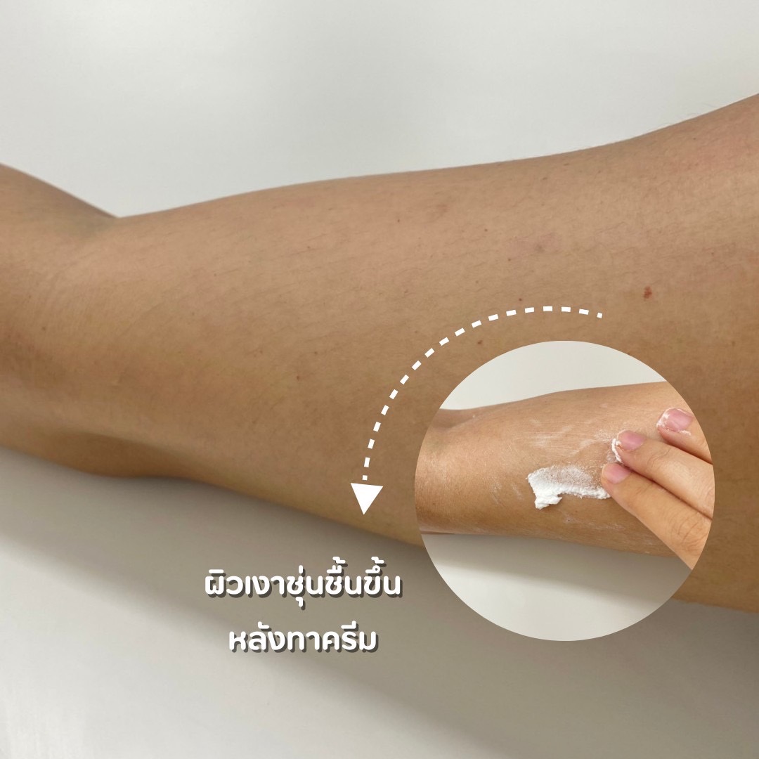 สัมผัสแรกคือเนื้อครีมนุ่มเหมือนจับวิปครีมที่เบาๆฟูๆ ตามด้วยกลิ่นหอมอ่อนๆ (ส่วนตัวเราชอบกลิ่นแบบนี้เพราะไม่ฉุน) หลังทารู้สึกชุ่นชื้นขึ้น ผิวดูเงาเหมือนคนสุขภาพดีตามที่เขาว่ากันเลยย แต่มันใช้เวลาเกลี่ยสักพักกว่าจะซึมเข้าผิวนะคะ ยังดีที่ออกมาไม่เหนียว อันนี้ตอบโจทย์คนขี้ร้อนแบบเราดี เพราะไม่ชอบครีมที่ทาแล้วเหนอะหนะเกินไป