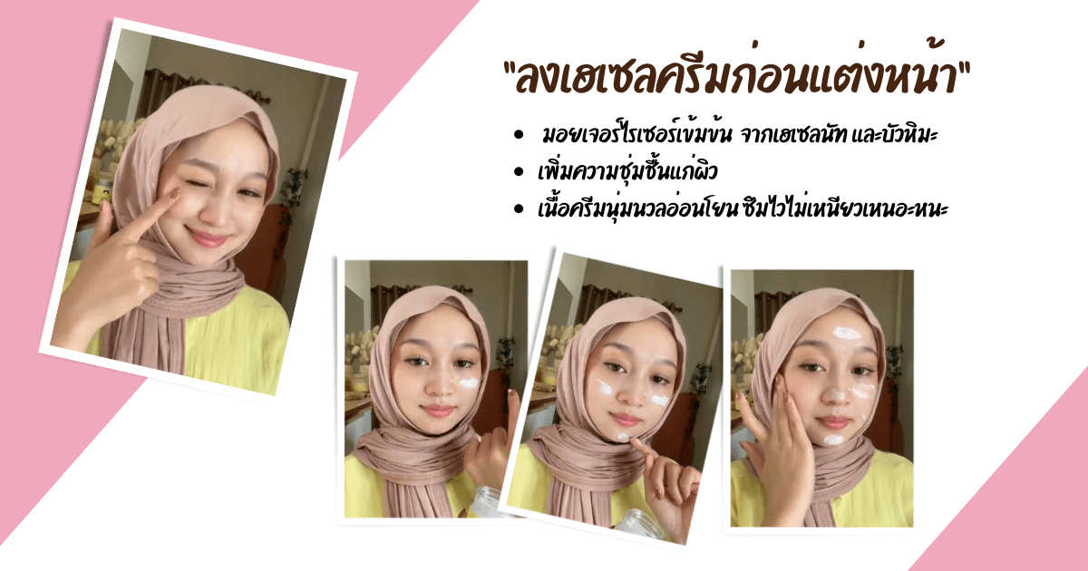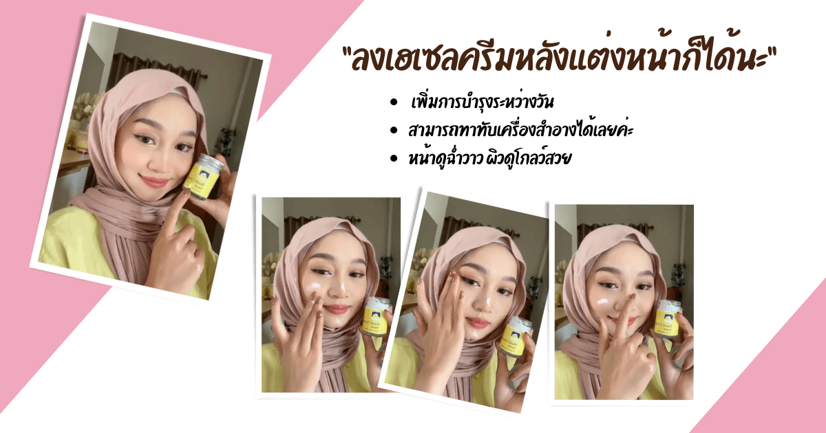 หรือจะลงเฮเซลครีมหลังแต่งหน้าก็ได้นะคะ สามารถทาทับเครื่องสำอางได้เลยค่ะ ไม่เหนียวเหนอะหนะ ซึมไวมากๆ ทาซ้ำได้ทั้งวันค่ะ