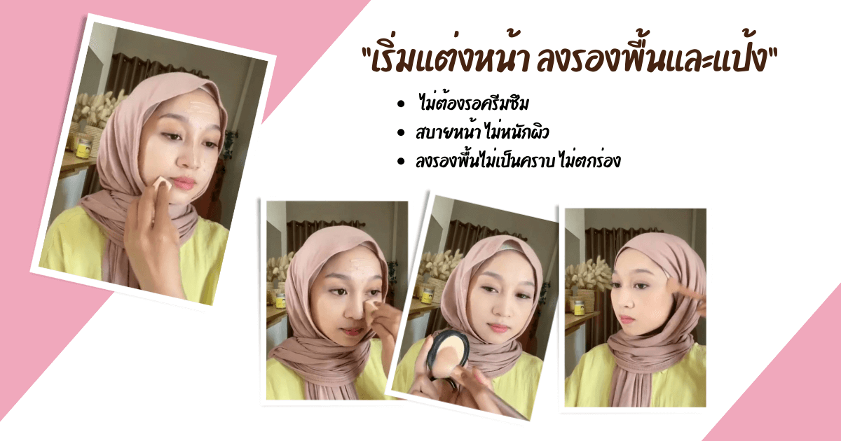 เริ่มแต่งหน้า โดยการลงรองพื้นและแป้ง แต่งได้เลยไม่ต้องนั่งรอครีมซึม หรือครีมเซ็ตตัวใดๆ เฮเซลครีมของเขาดีจริงๆ แถมยังให้สัมผัสที่สบายหน้า ไม่หนักผิวด้วยค่ะ ที่สำคัญลงรองพื้นกับแป้งก็ไม่ทิ้งคราบ แป้งไม่ตกร่องค่ะ