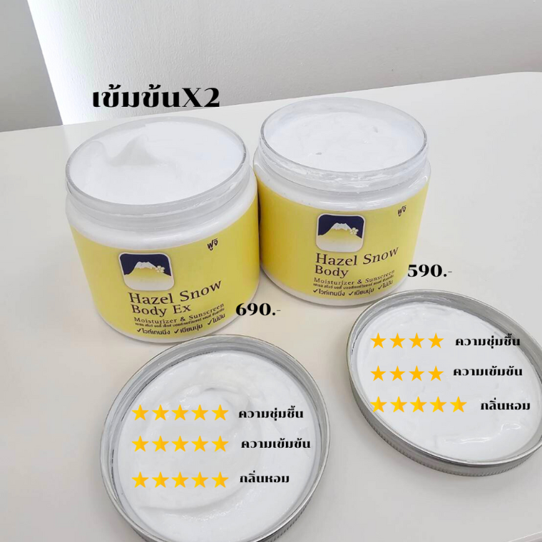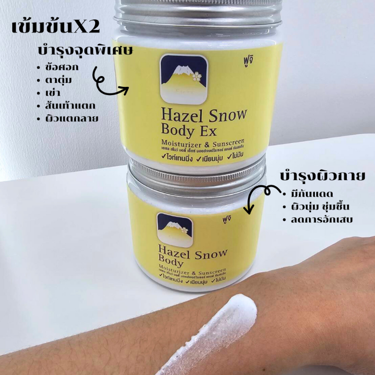 ส่วน Hazel Snow Body Ex ตัวนี้เนื้อครีมจะเข้มข้นมากกว่า เหมาะสำหรับคนผิวแห้งมาก หรือ ผิวที่ต้องการการบำรุงเป็นพิเศษ เน้นทาเฉพาะจุด เช่น ข้อศอก เข่า ตาตุ่ม ส้นเท้าแตก ท้องแตกลาย ตูดแตกลาย เค้าเน้นซ่อมแซม ช่วยบำรุงจุดแห้งกร้าน เนื้อครีมเค้ายังมีส่วนผสมของ สารสกัดจาก น้ำมันเฮเซลนัท แตงโมทะเลทราย และบัวหิมะ ที่ช่วยลดการอักเสบ มี Niacinamide ช่วยให้ผิวเนียนนุ่ม ชุ่มชื่น เด็กๆ คนท้อง คุณตาคุณยายก็ใช้ได้นะ ฉันจึงยกให้ ครีมภูเขา Hazel Snow Body Ex เป็นไอเท็มที่ต้องมีติดบ้านไว้เลยเธอ