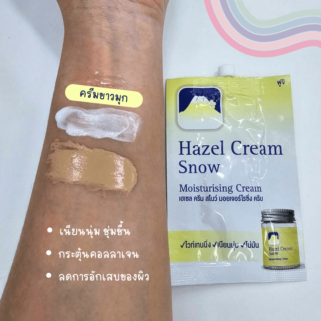 step ที่ 2 ครีม Hazel cream snow เนื้อครีมสีขาวมุก ที่มีส่วนผสมของน้ำมันเฮเซลนัล บัวหิมะ ช่วยลดการอักเสบ กระตุ้นคอลลาเจน ช่วยทำให้ผิวกระจ่างใส เนียนนุ่ม ชุ่มชื้น